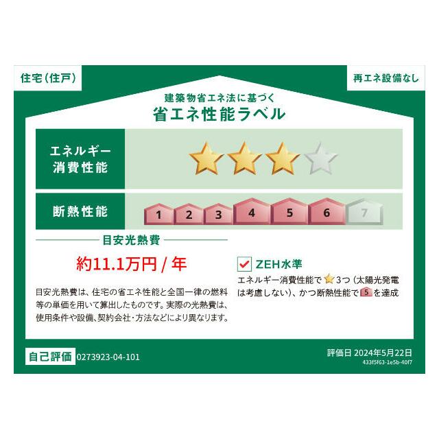 | エネルギー消費性能 | ★★★(削減率20%達成) | 断熱性能 | 6段階/7段階中 |